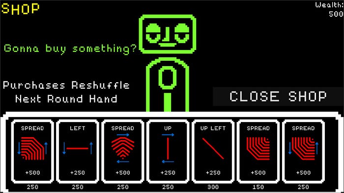 -The Card Shop adds more available options to choose from before starting the next round, with protection from duplicates in both the shop and your hand. Buying cards also re-rolls the hand selection, so it can be used as a tactical re-roll if needed.
